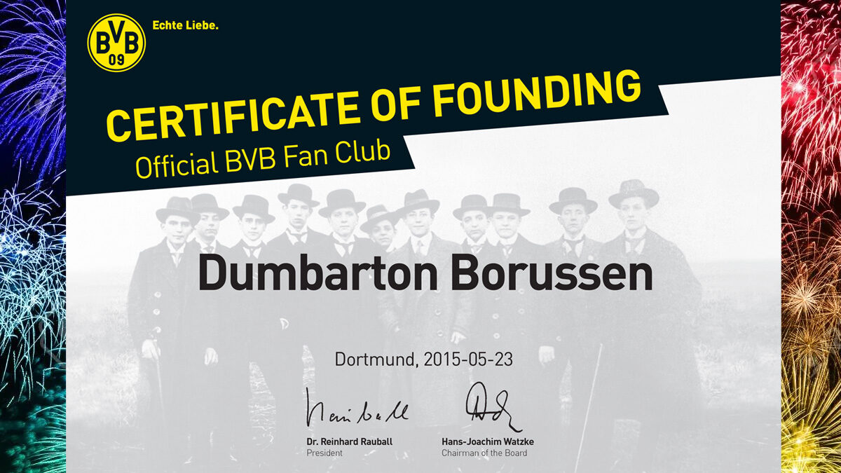 Dumbarton Borussen are proud to have received official BVB Fan Club status on 11.03.2022. After years of travelling around Germany following Borussia Dortmund we are now taking the next step in our journey by forming our Fan Club. We have continued to grow over the years and look forward to many more trips in the future. Heja BVB!